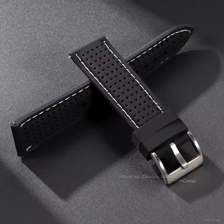 Ενα υπέροχο λουράκι σιλικόνης quick-release πολύ μαλακό με θέμα Ράλλυ, με τρύπες και ραφή σε χρώμα μαύρο και μαύρο-λευκό.