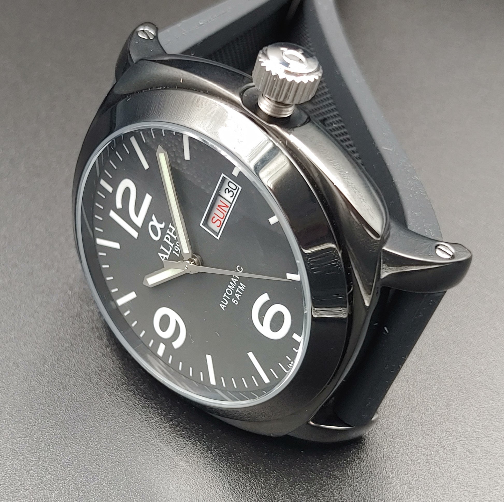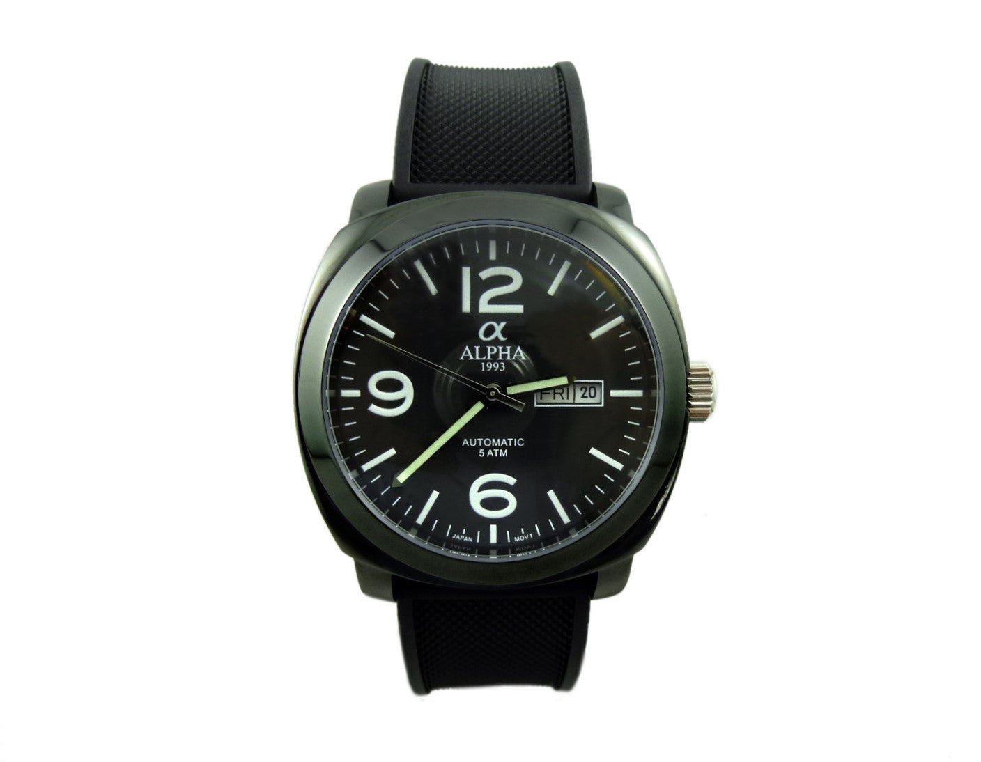 Alpha α 1993 Αυτόματο Μαύρο Γυαλιστερό Αυτόματο Μαύρο Καουτσούκ Λουράκι και Μαύρο Καντράν με Ημερομηνία και Ημέρα