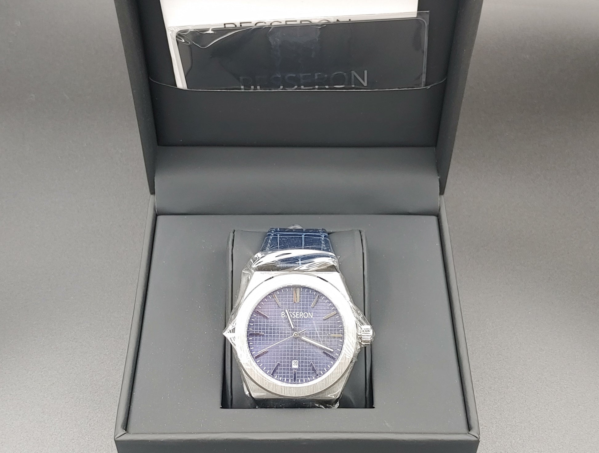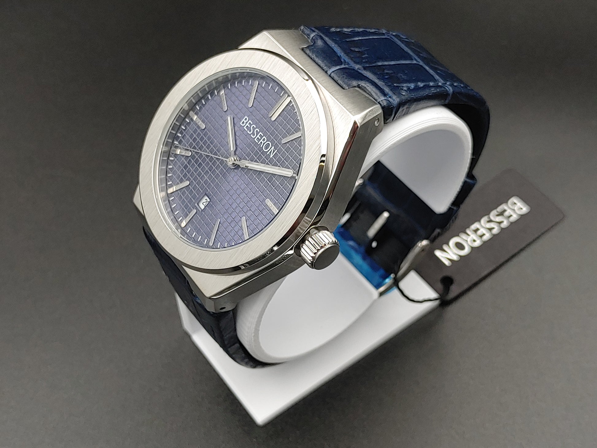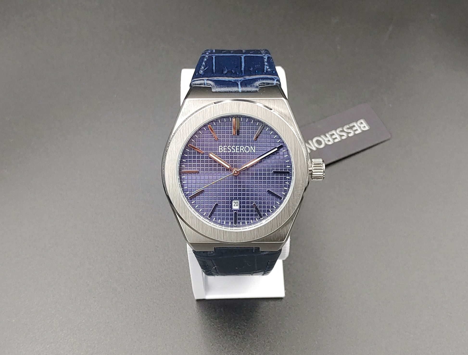 Besseron Ρολόι Μπαταρίας με Ημερομηνία Ασημί με Μπλέ Δερμάτινο Λουράκι